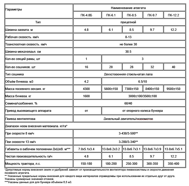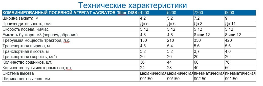 Оснащен собственным шнеком–загрузчиком и бункером 8м3 или 12м3. Агрегаты шириной захвата 6 метров и более имеют отдельный прицепной бункер и оснащены пневматической системой высева. Агрегаты шириной захвата 5.2 метра и менее имеют механическую систему высева и бункер на самой раме.