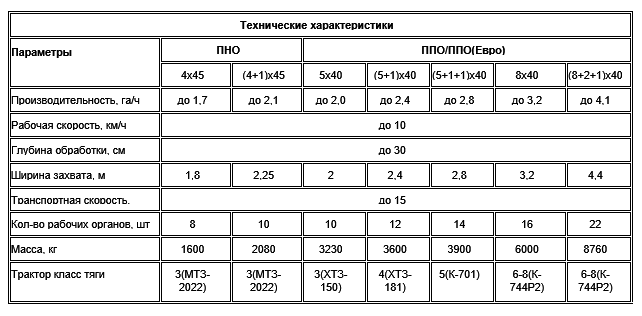 Плуги оборотные серии ПНО и ППО предназначены для пахоты почв с оборотом пласта на глубину до 30 см под зерновые и технические культуры, не засоренных камнями, плитняком и другими препятствиями с удельным сопротивлением 0,09 МПа и твердостью до 4,0 МПа (40 кг/см²). Применение оборотных плугов ПНО и ППО дает снижение расхода топлива, повышение производительности за счет экономии времени на отбивание загонок и исключения холостых перегонов, исключает образование свальных гребней и развальных борозд, что дает выравнивание почвы и повышает эффективность последующей обработки и, соответственно, урожайность.